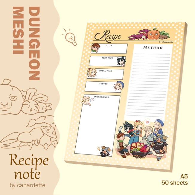 A notepad to write down your recipes inspired by Dungeon Meshi.